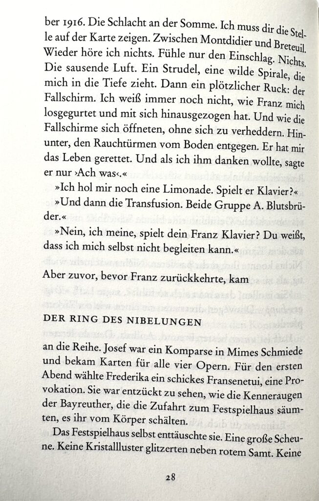 Worum geht es? Der Roman spielt in zwei Zeitabschnitten. Der erste beginnt ca. 1926 und reicht bis in die 1950er Jahre, der zweite beginnt 1957. Lucy, die Erzählerin, hat zwei ältere Zwillingsschwestern, Andrea und Doria, und adressiert ihren Text an Andrea. Ihre Mutter Frederika und ihr Vater Josef heirateten 1927 in Kitzingen. Da Frederika in der Ehe sexuell unbefriedigt blieb, nahm sie sich Josefs Freund Franz Huber als Liebhaber, der möglicherweise auch der Vater der Zwillinge ist. Lucy ist mit einem amerikanischen Musiker verheiratet, lebt in Providence, und hat auch einen Liebhaber, Laff(ayette). Mit Musik hat ein großer Teil beider Generationen der Familie zu tun, als Orchestermusiker, Lehrer und auch als Bayreuth-Besucher.